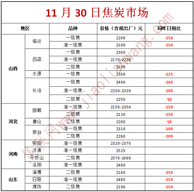 今日焦炭现货市场继续弱势运行。焦炭第三轮降价基本落地第四轮提降开启,11月下旬以来累计提降450元/吨左右,部分钢厂采购价第四轮提降150元/吨,已有部分焦企接受。河北、山东等地钢厂第四次提降焦炭采购价,累计幅度达450元/吨,降后汾渭唐山准一级焦2310元/吨到厂含税价,河钢集团焦炭采购到站价下调150元/吨至一级CSR65为2500元/吨,高硫S1为2350元/吨,累计下跌2轮,降幅300元。钢厂压价意愿较强,降价声音逐步蔓延,多控制到货量,部分焦企库存少量增加;山西吕梁部分焦企对第四轮提降较为抵触,对第四轮提降用户将停止发货,具体进展情况有待跟进。目前来看,焦炭价格后市大概率保持弱势运行。