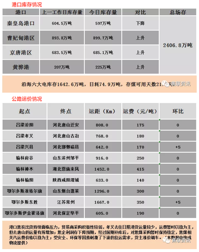秦皇岛港口卸车6637车,调入53.1万吨,装船60.6万吨,场存597万吨,锚地煤炭船舶31艘,预到13艘。沿海六大电库存1642.6万吨,日耗74.9万吨,存煤可用天数21.9天。