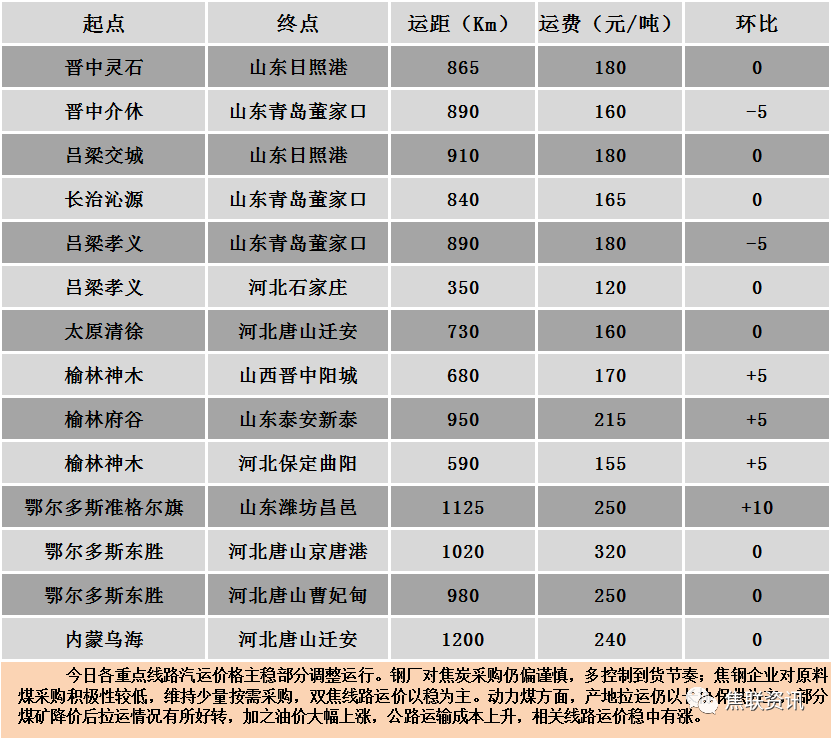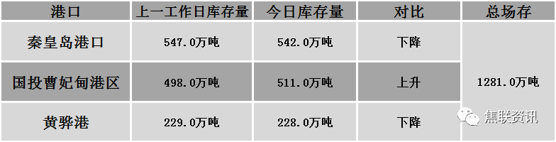 秦皇岛港铁路调入46.0万吨,装船51.0万吨,场存542万吨,锚地煤炭船舶38艘,预到9艘;国投曹妃甸港铁路调入25.2万吨,装船22万吨,场存511万吨,锚地煤炭船舶11艘,预到6艘;黄骅港铁路调入54.0万吨,装船56.0万吨,场存228万吨,锚地煤炭船舶20艘,预到0艘。