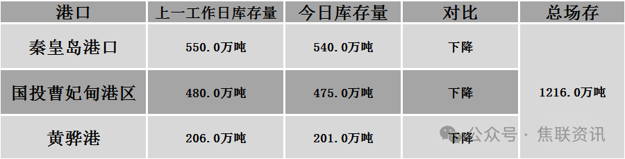 秦皇岛港铁路调入51.1万吨,装船61.1万吨,场存540万吨,锚地煤炭船16艘,预到12艘;国投曹妃甸港铁路调20.1万吨,装船25万吨,场存475万吨,锚地煤炭船舶2艘,预到4艘;黄骅港铁路调62.0万吨,装船64.0万吨,场存201万吨,锚地煤炭船舶77艘,预到0艘。