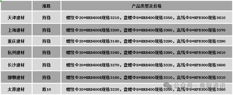 今日建筑钢材价格稳中调整运行,部分市场涨跌互现10元/吨。24个螺纹钢主要市场中,19个市场持平,占比79.17%,3个市场下跌,占比12.5%,2个市场上涨,占比8.33%。期货方面:日盘螺纹2601开3168收3167,最高3175最低3152,涨10涨幅0.32%;铁矿2601开805.5收805.5,最高808.0最低799.5涨2.0涨幅0.25%。钢厂调价:陕钢西安建材上调10;达钢重庆建材下调30。库存方面:本周五大主要钢材品种总库存下降9.13万吨至1510.61万吨,其中社会库存下降12.16万吨至1089.2万吨,钢厂库存增加3.03万吨至421.41万吨。行业方面:中钢协数据显示,9月中旬,重点统计钢铁企业共生产粗钢2073万吨,平均日产207.3万吨,日产环比下降0.6%;据此估算,本旬全国日产粗钢256万吨、环比下降0.6%,日产生铁229万吨、环比增长0.7%,日产钢材417万吨、环比增长2.7%。宏观方面:工信部等6部门印发《建材行业稳增长工作方案(2025—2026年)》;其中提出,严格水泥玻璃产能调控,严禁新增水泥熟料、平板玻璃产能。美国特朗普政府发布正式公告,实施美国与欧盟达成的贸易协议,确认自8月1日起,对欧盟进口汽车及汽车产品征收15%的关税。世界钢铁协会:8月全球粗钢产量1.453亿吨 同比提高0.3%。数字人民币国际运营中心正式运营。市场方面:本周五大钢材品种库存连增8周后出现首降,日盘螺纹、热卷主力先抑后扬,震荡微幅收红;主流焦企提涨焦炭第一轮50-55元/吨,焦炭主力期货上涨2%,报收于1760元/吨,焦煤主力最高上探至1239.0元/吨,收盘涨幅近1%。今日建材现货价格稳中小幅涨跌,商家多持谨慎观望态度,维持现有销售模式,低库存操作,积极出货为主,整体报价弱稳运行,下游终端还是按需采购,市场成交活跃度低,成交情况表现一般,预计短期建材现货价格或继续窄幅震荡运行。
