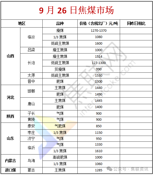 今日国内炼焦煤市场价格稳中上涨运行。供应方面,中秋、国庆假期之前煤矿安全检查压力加大,节前产量释放有限。随着焦炭开启提涨,继续带动焦煤市场成交活跃,近期受炼焦煤价格上涨影响,中间贸易环节以及洗煤广进场拿货增多,市场贸易氛活跃,叠加铁水产量持续高位,短期原料端刚需不减,大矿竞拍流拍率降至0附近。然煤价经过近期反弹之后,由于当前焦企利润不高,涨势有所放缓,部分高价煤种成交有一定压力。价格方面,现山西临汾地区瘦煤(A10-10.7、S0.4-0.8、G50-73)上调50-80元至出厂价1270-1370元/吨;吕梁地区主焦煤(A12.5、S0.5、G85)上调70元至出厂价1530元/吨,主焦煤(A10.5、S2.2、G85)下调81元至出厂价1182元/吨;晋中地区主焦煤(A13.5、S0.8、G80)上调21元至出厂价1290元/吨,肥煤(A9、S1.9、G95)上调20元至出厂价1300元/吨;太原地区主焦煤(A9.5、S0.5、G855)下调35元至出厂价1530元/吨。需求方面,下游企业生产仍处于较高水平,且铁水产量继续回升,下游企业高日耗以及低库存支撑焦煤需求,原料端刚需仍在。但炼焦煤涨幅较大,焦企即期利润缩小,加之下游补库节奏接近收尾,采购节奏放缓下,焦煤需求不及前期。综合来看,预计短期国内炼焦煤市场偏稳运行。蒙煤方面,临近假期,中蒙边境口岸即将闭关,供应收窄,当前贸易商报价高位下,部分下游接货较为谨慎。现蒙5原煤主流报价1050元/吨左右,蒙5精煤主流报价1285元/吨左右。