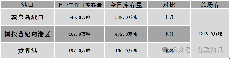 秦皇岛港铁路调入54.7万吨,装船51.7万吨,场存548万吨,锚地煤炭船26艘,预到6艘;国投曹妃甸港铁路调24.3万吨,装船19.5万吨,场存472万吨,锚地煤炭船舶4艘,预到2艘;黄骅港铁路调63.0万吨,装船71.0万吨,场存196万吨,锚地煤炭船舶41艘,预到0艘。