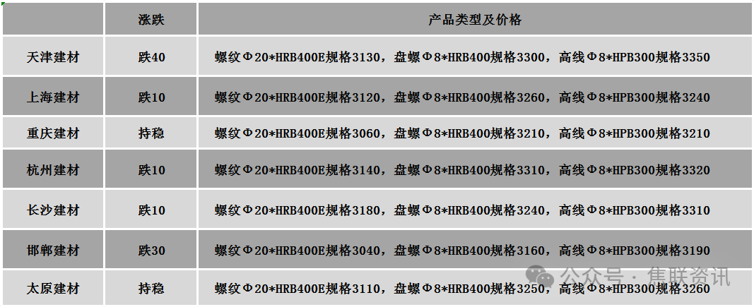 今日建筑钢材价格弱势调整运行,多数市场下跌10-20元/吨。24个螺纹钢主要市场中,16个市场下跌 ,占比66.67%,7个市场持平,占比29.16%,1个市场上涨,占比4.17%。期货方面:日盘螺纹2601开3090收3061,最高3093最低3039,跌25跌幅0.81%;铁矿2601开806.5收782.0,最高809.5最低774.0跌16.5跌幅2.07%。钢厂调价:江苏鸿泰螺纹钢下调10;云南德胜建材下调10;陕钢西安建材下调20;玉溪玉昆建材下调30。行业方面:中钢协数据显示,2025年10月上旬,重点统计钢铁企业共生产粗钢2032万吨,平均日产203.2万吨,日产环比增长7.5%;生铁1875万吨,平均日产187.5万吨,日产环比增长3.2%;钢材1961万吨,平均日产196.1万吨,日产环比下降8.5%。宏观方面:商务部新闻发言人就近期美方宣布对华加征关税等限制措施答记者问:“打,奉陪到底;谈,大门敞开”。美对华造船等行业301调查限制措施落地 商务部:敦促美方纠正错误做法。世界钢铁协会:预计2025年全球钢铁需求量将达到约17.5亿吨。中汽协:2025年我国汽车出口有望超650万辆。中汽协:1—9月份汽车销售2436.3万辆 同比增长12.9%。现货黄金首次涨至4150美元/盎司关口,日内涨约1%,年内累计上涨超1500美元,涨幅58%。市场方面:受整体市场氛围偏弱影响,日盘螺纹、热卷期货盘中创逾3个月新低,均跌幅近1%;双焦期货先跌后涨,盘中一度触及逾1个月低位,尾盘价格快速拉升,焦煤主力最低下探至1116.0元/吨,焦炭主力最低下探至1607.0元/吨。期螺维持弱势震荡走势,市场交易氛围低迷,建材现货价格持续承压运行,终端需求释放缓慢,商家采购积极性不高,维持积极出货操作,整体成交表现一般,考虑到现货价格上行动力不足,预计短期建材现货价格或延续弱势运行为主。