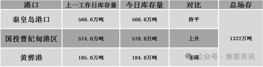 秦皇岛港铁路调入48.2万吨,装船48.2万吨,场存560万吨,锚地煤炭船11艘,预到9艘;国投曹妃甸港铁路调21.8万吨,装船17.5万吨,场存578万吨,锚地煤炭船舶4艘,预到7艘;黄骅港铁路调60.0万吨,装船68.0万吨,场存184万吨,锚地煤炭船舶68艘,预到0艘。