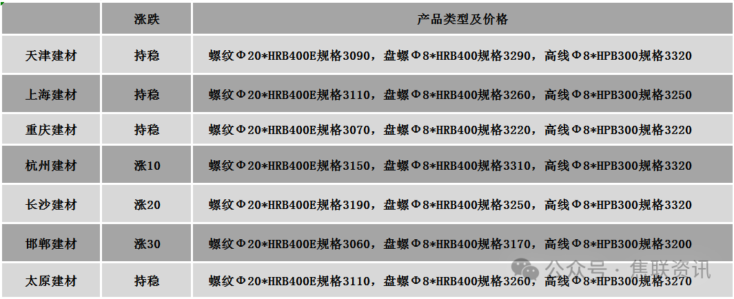 今日建筑钢材价格稳中调整运行,部分市场涨跌互现10-30元/吨。24个螺纹钢主要市场中,16个市场持平,占比66.66%,4个市场上涨,占比16.67%,4个市场下跌,占比%16.67%。期货方面:日盘螺纹2601开3048收3068,最高3068最低3045,涨18涨幅0.59%;铁矿2601开772.5收774.0,最高777.5最低771.0涨 5.0涨幅0.65%。行业方面:从房地产开发投资情况来看,17个省市1-9月投资额超千亿。排在前三名的分别是浙江、广东和江苏,1-9月投资额分别为7336.28亿元、6949.34亿元和6828.85亿元。宏观方面:高盛发布研报称,中国股市将进入更为持久的上涨阶段,预计关键指数到2027年底将有约30%的上涨空间,主要由12%的盈利趋势增长和5%-10%的进一步重估潜力推动。中汽协:1-9月汽车销量排名前十位的企业(集团)共销售2043.1万辆。香港交易所董事总经理巴曙松:黄金全球总市值已突破27万亿美元 成为全球第二大储备资产。日盘钢材期货震荡波动运行,螺纹主力最高上涨至3068元/吨,热卷最高上探至3249元/吨;焦煤、焦炭期货小幅反弹,焦煤焦炭主力分别报收于1209.5元/吨和1709.5元/吨。期螺震荡波动,现货价格也持稳为主,部分市场小幅波动,钢厂报价也大多持稳。目前电炉钢厂依旧处于亏损状态,厂家挺价意愿较强,在期钢价格小幅收涨的情况下,市场推涨情绪较高,但是考虑到当前需求释放未出现明显好转,预计短期建材现货价格或继续窄幅震荡运行。