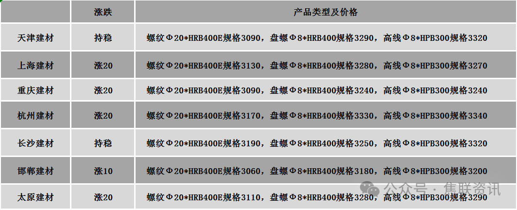 今日建筑钢材价格稳中小幅上涨运行,部分市场上涨10-30元/吨。24个螺纹钢主要市场中,13个市场持平,占比54.17%,11个市场上涨,占比45.83%。期货方面:日盘螺纹2601开3072收3071,最高3083最低3059,涨13涨幅0.43%;铁矿2601开777.0收777.0,最高782.0最低777.0涨 3.0涨幅0.39%。钢厂调价:云南德胜、玉溪玉昆、玉溪仙福建材上调10。库存方面:本周五大主要钢材品种总库存下降27.41万吨至1554.85万吨,其中社会库存下降26.14万吨至1099.70万吨,钢厂库存下降1.27万吨至455.15万吨。行业方面:中国钢铁工业协会数据显示,10月中旬,21个城市5大品种钢材社会库存936万吨,环比减少10万吨,下降1.1%,库存小幅波动;比年初增加277万吨,上升42.0%;比上年同期增加205万吨,上升28.0%。宏观方面:国家能源局今天发布用电量数据显示,9月份,全社会用电量8886亿千瓦时,同比增长4.5%。李家超:将积极争取更多国际机构落户香港 包括亚洲基础设施投资银行。前三季度霍尔果斯口岸进出口货运量3488.1万吨。前三季度国家铁路发送货物30.3亿吨 同比增长3.4%。前9月全国已发行城中村改造专项债816亿元 同比增长1.4倍。德国联邦统计局:2025年前8个月 中国成德国最大贸易伙伴。欧盟成员国批准对俄罗斯实施第19轮制裁,制裁措施包括禁止进口俄罗斯液化天然气等。日盘钢材期货继续小幅反弹,螺纹收报于3070元/吨,热卷实现四连阳;双焦期货大幅上涨,焦煤主力最高上涨至1261元/吨,收盘涨幅超5%,焦炭主力涨幅超4%,最高上探至1769元/吨。日盘期螺震荡收涨,部分建材现货价格小幅拉涨,局部钢厂小幅上调报价,绝大多数钢厂价格持稳,终端需求仍然低迷,钢厂出货意愿较强,商家多持谨慎观望态度,现货价格探涨乏力,考虑到当前正召开重要会议,宏观政策导向将决定价格走向,预计短期建材现货价格或窄幅震荡运行。