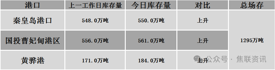 秦皇岛港铁路调入59.8万吨,装船57.8万吨,场存550万吨,锚地煤炭船26艘,预到12艘;国投曹妃甸港铁路调28.6万吨,装船23.5万吨,场存561万吨,锚地煤炭船舶4艘,预到5艘;黄骅港铁路调66.0万吨,装船64.0万吨,场存184万吨,锚地煤炭船舶83艘,预到0艘。