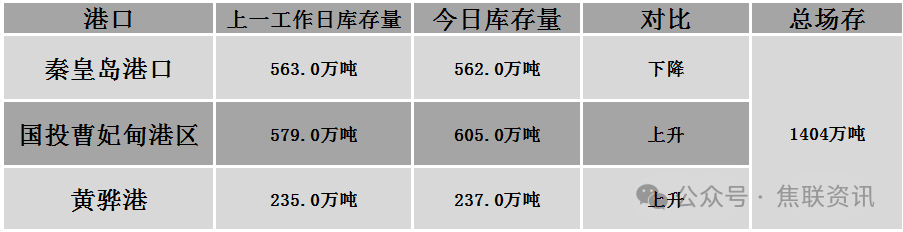 秦皇岛港铁路调入58.7万吨,装船59.7万吨,场存562万吨,锚地煤炭船25艘,预到11艘;国投曹妃甸港铁路调27.7万吨,装船20.5万吨,场存605万吨,锚地煤炭船舶3艘,预到7艘;黄骅港铁路调55.0万吨,装船8.0万吨,场存237万吨,锚地煤炭船舶62艘,预到0艘。