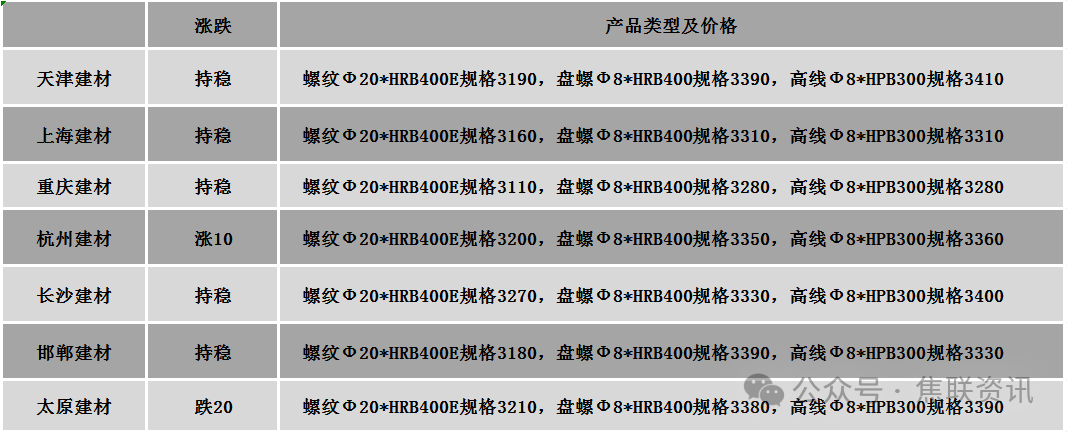 今日建筑钢材价格稳中偏弱运行,少部分市场涨跌互现10元/吨左右。24个螺纹钢主要市场中,19个市场持平,占比79.17%,4个市场上涨,占比16.67%,1个市场下跌,占比4.16%。期货方面:日盘螺纹2601开3093收3110,最高3113最低3084,涨22涨幅0.71%;铁矿2601开797.5收794.0,最高798.0最低786.0,跌1.5跌幅0.19%。行业方面:沙钢公布2025年12月份建材销售计划折扣情况:螺纹2折(上月0.5折),盘螺0折(上月0折)。2025年永钢12-1期折扣:螺纹3折(上期3折),线盘5折(上期5.5折)。2025年中天钢铁12-1期华东地区建材计划量折扣为:螺纹3.5折(上期4折),线材6.5折(上期6.5折),盘螺6.5折(上期6.5折)。另外,海口螺纹和盘螺2折(上期0折),广州螺纹0折(上期0折)。宏观方面:中共中央政治局11月28日召开会议,审议《关于二十届中央巡视省(自治区、直辖市)情况的综合报告》。现房销售制度改革提速,多地谋划现房销售支持政策。OPEC+成员本周末开会时可能会维持在2026年初暂停增产的决定。市场方面:日盘期钢价格维持震荡运行,螺纹、热卷仍然徘徊在3100点和3300点整数关口附近;双焦期货继续弱势下行,焦煤主力合约9连跌,焦炭主力收盘跌幅近2%。期螺小幅收红,建材现货价格稳中调整运行,钢厂报价保持坚挺,商家报价多数暂稳,以消化库存为主,下游按需备货谨慎采购,成交多低价刚需资源,整体交易氛围表现一般。当前淡季特征不断显现,终端需求释放有限,市场观望氛围较浓,整体市场心态偏谨慎,预计短期建材现货价格或低位盘整运行。
