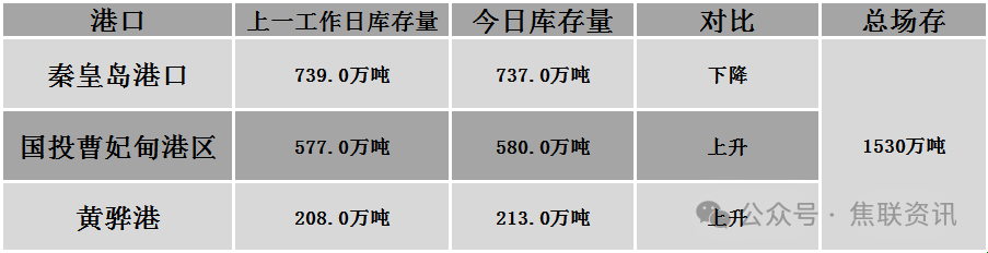 秦皇岛港铁路调入49.8万吨,装船51.8万吨,场存737万吨,锚地煤炭船16艘,预到10艘;国投曹妃甸港铁路调20.1万吨,装船17.0万吨,场存580万吨,锚地煤炭船舶3艘,预到3艘;黄骅港铁路调58.0万吨,装船50.0万吨,场存213万吨,锚地煤炭船舶41艘,预到0艘。