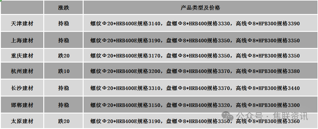 今日建筑钢材价格稳中偏弱运行,部分市场下跌10-20元/吨。24个螺纹钢主要市场中,16个市场持平,占比66.67%,8个市场下跌,占比33.33%。期货方面:日盘螺纹2605开3077收3060,最高3082最低3057,跌27跌幅0.87%;铁矿2605开757.0收760.5,最高764.5最低756.0,跌2.5跌幅0.33%。钢厂调价:云南德胜、玉溪玉昆、玉溪仙福、达钢重庆建材下调10。行业方面:本周全国90家独立电弧炉钢厂平均产能利用率52.77%,环比下降1.05个百分点,同比下降0.2个百分点。全国90家独立电弧炉钢厂平均开工率67.73%,环比上升0.01个百分点,同比上升0.41个百分点。宏观方面:中央经济工作会议12月10日至11日在北京举行,会议对明年的财政政策明确定调,要求继续实施更加积极的财政政策;继续实施好适度宽松的货币政策 为经济稳定增长和金融市场稳定运行创造良好的货币金融环境。工信部、央行发布关于用好绿色金融政策支持绿色工厂建设的通知,其中提到,支持金融机构制定绿色金融支持绿色工厂工作方案,支持符合条件的企业发行绿色债券和转型债券。市场方面:日盘双焦期货继续大幅下跌,焦煤主力收盘跌幅超4%,最低下探至1009.0元/吨,继续刷新7月下旬以来的新低;焦炭第二轮提降落地,主力收盘跌幅超3%。螺纹、热卷盘面继续小幅回调,螺纹最低下探至3057元/吨,热卷收报于3232元/吨。日盘期螺低位运行,部分建材现货价格小幅下跌,下游采购观望情绪较浓,市场交易活跃度一般,室外施工逐渐停滞,用钢需求进一步下降,在供需双弱的情况下,价格反弹动力不足,预计短期建材现货价格或窄幅调整运行。