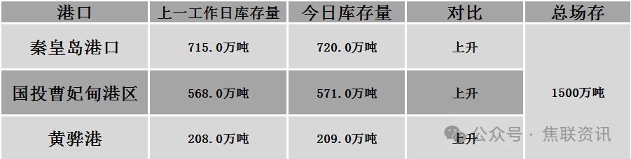 秦皇岛港铁路调入41.6万吨,装船36.6万吨,场存720万吨,锚地煤炭船14艘,预到6艘;国投曹妃甸港铁路调13.4万吨,装船10.5万吨,场存571万吨,锚地煤炭船舶7艘,预到0艘;黄骅港铁路调53.0万吨,装船60.0万吨,场存209万吨,锚地煤炭船舶25艘,预到0艘。