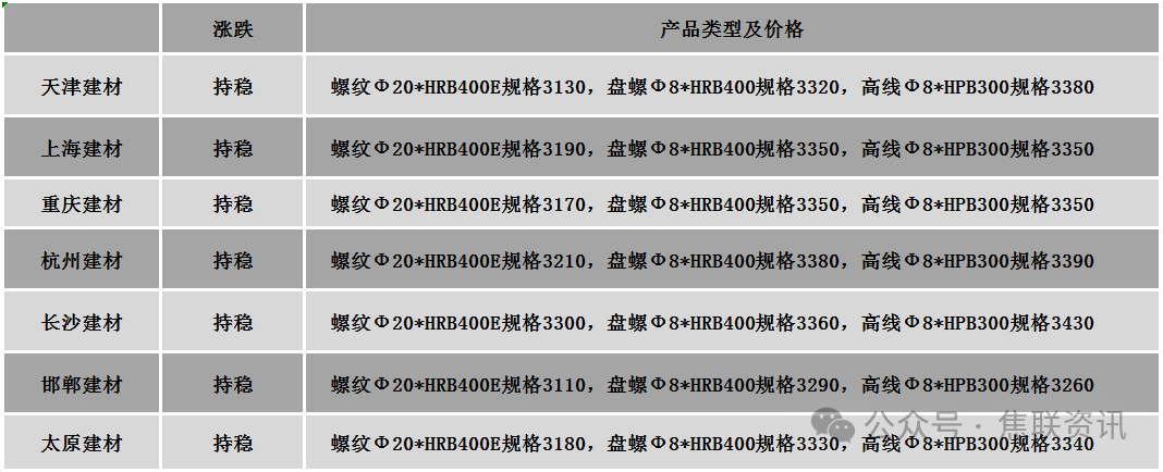 今日建筑钢材价格稳中调整运行,部分市场涨跌互现10元/吨。24个螺纹钢主要市场中,16个市场持平,占比66.67%,6个市场上涨,占比25%,2个市场下跌,占比8.33%。期货方面:日盘螺纹2605开3075收3081,最高3095最低3065,涨17涨幅0.55%;铁矿2605开755.0收761.0,最高764.0最低752.0,涨8.0涨幅1.06%。钢厂调价:达钢重庆建材上调20;玉溪玉昆、玉溪仙福建材上调100。行业方面:上周(12月8日-12月14日),10个重点城市新建商品房成交(签约)面积总计181.08万平方米,环比增长13.6%,同比下降39.3%。同期,10个重点城市二手房成交(签约)面积总计197.92万平方米,环比增长1.5%,同比下降32.9%。宏观方面:在岸、离岸人民币对美元刷新逾一年来新高。1至11月全国铁路发送旅客42.8亿人次 创历史同期新高。国家发改委:加快健全扩大内需体制机制,推动清理汽车、住房等消费不合理限制性措施。年内专项债券投向政府投资基金合计规模近850亿元。12月16日出版的第24期《求是》杂志发表习近平的重要文章《扩大内需是战略之举》。文章指出,要建立和完善扩大居民消费的长效机制,使居民有稳定收入能消费、没有后顾之忧敢消费、消费环境优获得感强愿消费。市场方面:日盘期钢盘面震荡小幅上行,螺纹最低下探至3065元/吨,热卷最低下探至3226元/吨;双焦期货持续反弹,焦煤最高上涨至1077.0元/吨,焦炭最高上涨至1688元/吨。期螺震荡上涨,现货价格稳中偏强,市场心态有所支撑,低位资源有所减少,终端需求采购增多,整体成交氛围稍有改善。考虑到下游需求释放延续弱势,需求不及预期,预计短期建材现货价格或稳中局部小幅调整运行。