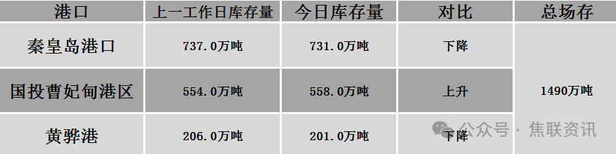 秦皇岛港铁路调入42万吨,装船48万吨,场存731万吨,锚地煤炭船23艘,预到13艘;国投曹妃甸港铁路调入15.0万吨,装船11万吨,场存558万吨,锚地煤炭船舶0艘,预到2艘;黄骅港铁路调入44万吨,装船42万吨,场存201万吨,锚地煤炭船舶26艘。