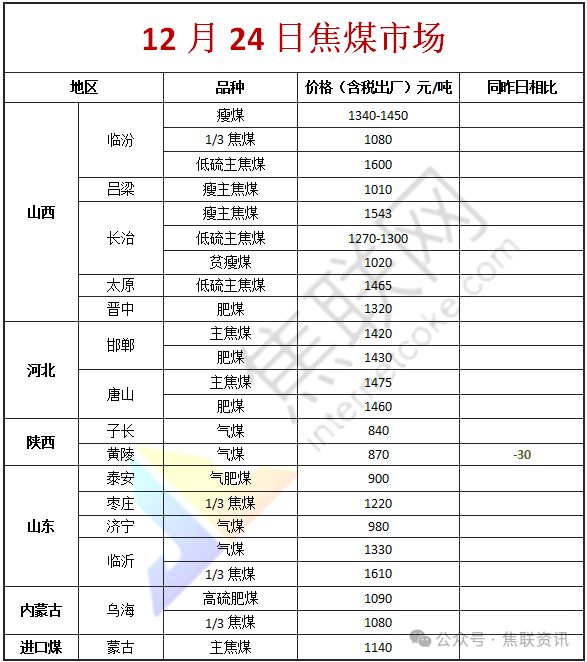 今日国内炼焦煤市场价格窄幅下调运行。供应方面,近期部分矿井已经完成了年度产能任务,逐渐有矿井限产、停产,焦煤供应释放有限。然下游及多数中间贸易环节以对后市持观望态度,采购量较小,相对谨慎,影响个别地区部分煤种出货有所放缓。线上竞拍市场多以流拍或降价为主,部分低价资源成交氛围略有改善,然高价资源成交仍显乏力,整体价格震荡偏弱运行。价格方面,现山西临汾地区主焦煤(A11、S3.5、G92)上调7元至出厂价1097元/吨.瘦精煤(A10.5、S0.6、G50)上调12元至出厂价1112元/吨;吕梁地区主焦煤(A10.5、S3.0、G85)下调37元至出厂价1183元/吨;长治地区瘦原煤(S3、G60、回收50)上调38元至出厂价536元/吨;陕西黄陵地区气精煤(A7.0、S0.45、G70)下调30元至出厂价870元/吨。需求方面,现下游利润不佳,提产积极性不到,暂时也不会开启大规模补库节奏,然库存也在低位运行,焦企少部分补库需求释放,短期内继续维持刚需采购,考虑钢厂仍有打压原料想法,整体采购心态偏弱。综合来看,预计短期国内炼焦煤市场弱稳运行。蒙煤方面,口岸贸易企业出货压力增大,下游接货意愿依然不高,观望情绪浓厚。现蒙5原煤主流报价996元/吨左右,蒙5精煤主流报价1140元/吨左右。