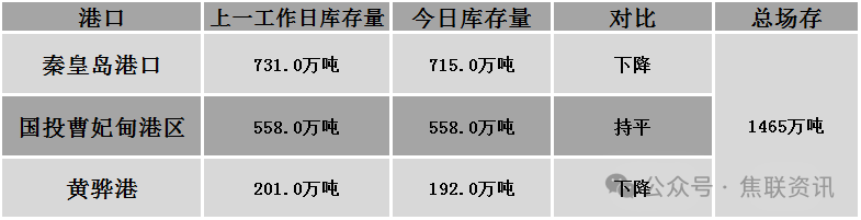 秦皇岛港铁路调入42万吨,装船48万吨,场存731万吨,锚地煤炭船23艘,预到13艘;国投曹妃甸港铁路调入15.0万吨,装船11万吨,场存558万吨,锚地煤炭船舶0艘,预到2艘;黄骅港铁路调入44万吨,装船42万吨,场存201万吨,锚地煤炭船舶26艘。