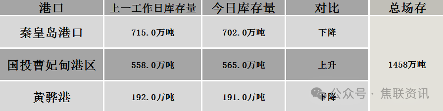秦皇岛港铁路调入45万吨,装船58万吨,场存702万吨,锚地煤炭船22艘,预到9艘;国投曹妃甸港铁路调入21万吨,装船14万吨,场存565万吨,锚地煤炭船舶0艘,预到6艘;黄骅港铁路调入42万吨,装船43万吨,场存191万吨,锚地煤炭船舶38艘。