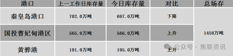 秦皇岛港铁路调入42.5万吨,装船47.5万吨,场存697万吨,锚地煤炭船17艘,预到9艘;国投曹妃甸港铁路调入20.1万吨,装船19万吨,场存566万吨,锚地煤炭船舶1艘,预到7艘;黄骅港铁路调入44万吨,装船51万吨,场存195万吨,锚地煤炭船舶38艘。