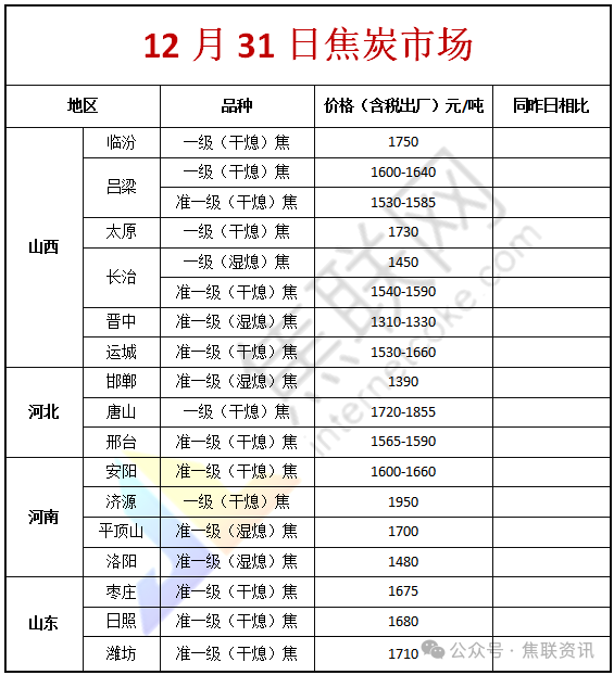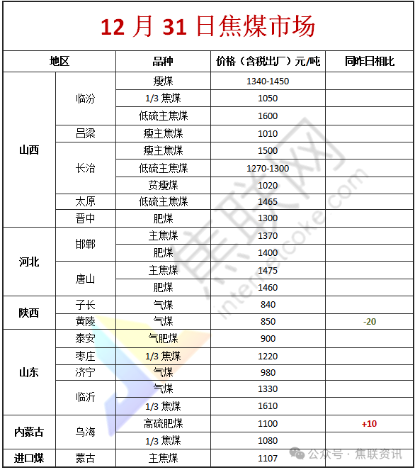 今日国内焦炭市场弱势下调。山东及河北主导钢厂对焦炭采购价格下调50-55元/吨,于2026年1月1日零点执行,焦炭第四轮提降全面落地,截至目前累计降幅200-220元/吨。供应方面,焦炭经过四轮降价,焦企利润进一步收窄,出现亏损的焦企数量有所增加。但当前除少数焦企有减产限产外,多数焦企依旧保持正常生产水平,焦炭产量较前期未有明显下滑,叠加下游钢厂采购积极性偏弱,导致焦企出货情况不佳,厂内焦炭库存多有累库现象,焦炭供应延续宽松格局。现山西地区主流准一级干熄焦报1535-1615元/吨。需求方面,近期钢厂焦炭到货情况良好,厂内焦炭库存多处中高位水平,然考虑到终端需求依旧较差,钢材市场仍然承压,且成材价格窄幅震荡,钢厂利润依旧不佳,对焦炭采购节奏有所放缓,多以刚需采购为主。港口方面,港口焦炭现货暂稳运行,市场交投氛围欠佳,贸易商集港量较少,现港口准一级湿熄焦主流现汇出库价报1450元/吨(-)。综合来看,钢厂受终端需求表现疲软以及利润不佳影响,日均铁水产量依旧处于低位,且并未出现集中高炉复产预期,市场情绪总体偏向悲观,不排除钢厂对焦炭有继续提降的可能,预计短期焦炭市场偏弱运行。后期需持续关注钢厂生产情况、原料煤价格走势、宏观政策、运输情况、焦炭库存变化、焦炭供需情况、焦钢利润等对焦炭市场的影响。