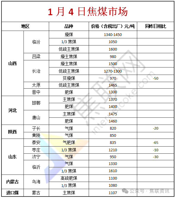 今日国内炼焦煤市场承压偏弱运行。供应方面,节后第一天开工,前期因生产任务停产煤矿大面积开工,煤矿生产快速恢复,短期炼焦煤产量有望回升。目前焦炭第四轮提降已全面落地,且仍有再降预期,原料端情绪降温明显,中间环节多下调报价加快出货,下游焦企也多减缓采购,煤矿签单不畅,多煤种报价出现下调。价格方面,现山西临汾地区主焦煤(A9、S0.5、G85)下调100元至出厂价1500元/吨,主焦煤(A10、S0.45、G70)下调40元至出厂价1350元/吨;吕梁地区主焦煤(A12.5、S0.8、G80)下调30元至出厂价1440元/吨,主焦煤(A11、S1.5、G80)下调30元至出厂价1130元/吨,主焦煤(A8.5、S1.3、G75)下调19元至出厂价1211元/吨,肥煤(A10.5、S1.5、G90)下调100元至出厂价1300元/吨,瘦主焦煤(A7.5、S2.2、G70)下调20元至出厂价980元/吨,瘦原煤(S1.2、G70、回收50)下调80元至出厂价620元/吨,气原煤(S0.9、G55、回收48)下调11元至出厂价334元/吨,气原煤(S1.6、G70、回收40)上调7元至出厂价253元/吨;长治地区贫瘦精煤(A10.5、S0.4、G14)下调50元至出厂价970元/吨,瘦精煤(A10.5、S0.5、G50)下调50元至出厂价1050元/吨;忻州地区气原煤(S0.9、G60、回收55)上调14元至出厂价536元/吨。需求方面,焦炭价格经过四轮下调,焦企利润受到挤压,对高价煤的接受力度有限,市场情绪走低,后市仍有看降预期,当前对炼焦煤的采购也相对谨慎,多以刚需采购为主。综合来看,焦煤需求偏弱,短期价格仍以小幅下调为主。蒙煤方面,元旦期间口岸成交较少,进口蒙煤市场询盘问价冷清,下游企业贸易商情绪不高,实际成交一般。现蒙5原煤主流报价960元/吨左右,蒙5精煤主流报价1107元/吨左右。
