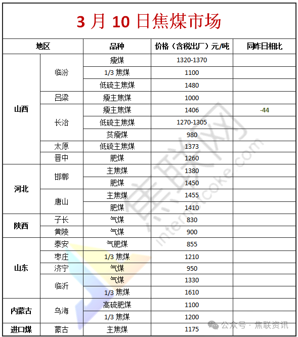 今日国内炼焦煤市场稳中偏弱运行,多数矿点价格持稳运行。供应方面,随着煤矿陆续复产,供应已略显宽松。近期煤矿降完价之后出货较前期有所好转,溢价情况明显增多,市场情绪有所缓和。然上游部分煤矿价格偏高的煤种仍出货不畅,线上高价煤流拍现象依旧存在,短期炼焦煤价格依旧会窄幅调整。价格方面,现山西吕梁地区主焦原煤(S1.3、G75、回收45)上调44元至出厂价786元/吨,主焦煤(A9.5、S2.2、G80)上调15元至出厂价1235元/吨,肥煤(A10.5、S1.5、G90)上调50元至出厂价1400元/吨,1/3焦原煤(S1.5、G70、回收58)上调2元至出厂价613元/吨,瘦主焦煤(A7.5、S2.2、G70)上调20元至出厂价1020元/吨;长治地区主焦煤(A8、S0.4、G65)下调50元至出厂价1400元/吨,瘦主焦煤(A8.0、S0.5、G70)下调44元至出厂价1406元/吨;晋中地区瘦精煤(A9.5、S3.0、G65)上调20元至出厂价1080元/吨;忻州地区气原煤(S2.5、G60、回收45)下调10元至出厂价340元/吨,1/3焦煤(A28.7、S1.9、G79)上调47元至出厂价775元/吨。需求方面,焦炭首轮降价后,焦企利润亏损,虽厂内库存不多,但当前煤价下行速度缓慢,焦化企业对较高煤价的接受度一般,对部分价格已调整至心理预期区间的煤种进行适量补库。综合来看,预计短期国内炼焦煤市场震荡调整运行。蒙煤方面,下游拿货意愿不足,多持观望心态,口岸成交氛围一般,蒙煤报价小幅波动。现蒙5原煤主流报价1043元/吨左右,蒙5精煤主流报价1175元/吨。
