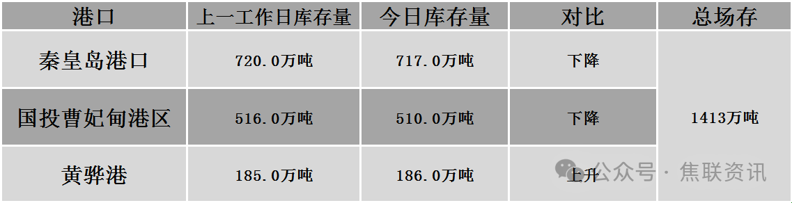 秦皇岛港铁路调入46.9万吨,装船49.9万吨,场存717万吨,锚地煤炭船28艘,预到7艘;国投曹妃甸港铁路调18.5万吨,装船24.5万吨,场存510万吨,锚地煤炭船舶5艘,预到6艘;黄骅港铁路调51.0万吨,装船65.0万吨,场存186万吨,锚地煤炭船舶45艘。