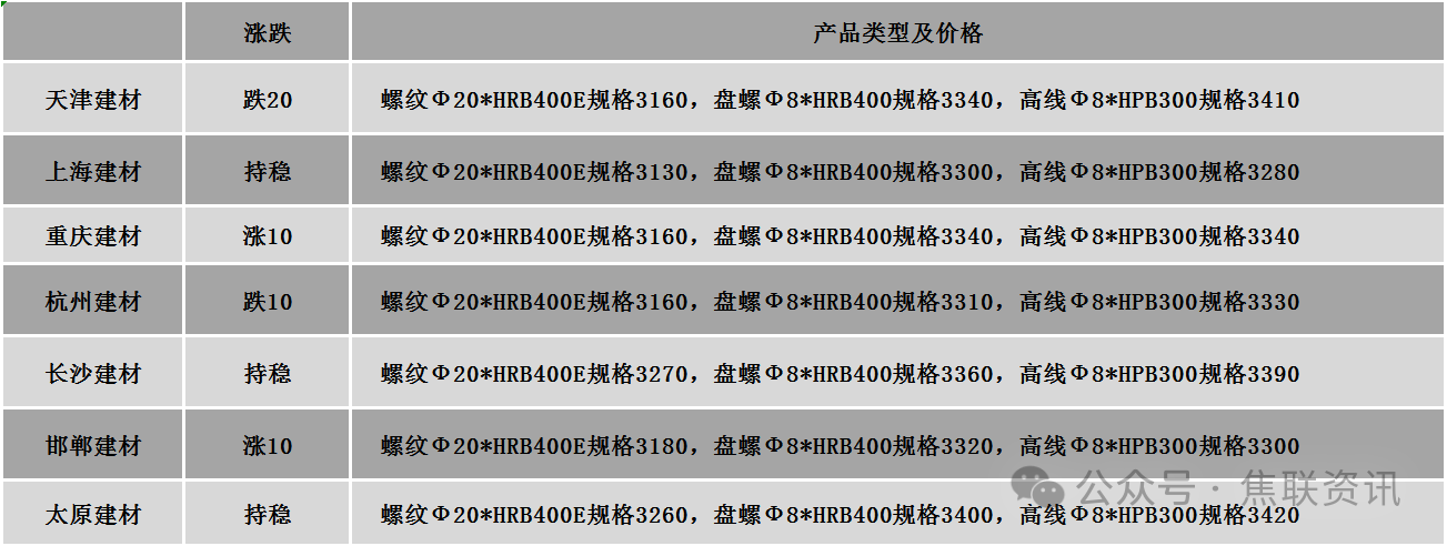 今日钢材价格稳中调整运行,部分地区涨跌互现10-20元/吨。涨跌占比:24个螺纹钢主要地区中,12个地区持平,占比50%,7个地区下跌,占比29.16%,5个地区上涨,占比20.83%。原料方面:唐山150*150普碳方坯价格2980元/吨。螺纹钢(HRB400 φ25)均价上涨2元至3440元/吨;高线(HPB300 φ8)均价3586元/吨;热轧卷板(Q235B/SS400 3.0*1500*C)均价3474元/吨;冷轧卷板(ST12/DC01 1.0mm*1250*C)均价3929元/吨;中厚板(Q235B 20mm*2000*L)均价至3515元/吨。期货价格:日盘螺纹2605开3120收3114,最高3120最低3097,跌6跌幅0.19%;铁矿2605开802.5收789.0,最高802.5最低785.5,跌11.5跌幅1.44%。钢厂调价:江苏鸿泰螺纹钢下调10;新抚钢螺纹钢上调10;达钢重庆建材上调30。市场方面:当地时间4月8日,美伊临时停火生效的第一天,以军对黎真主党发动本轮冲突以来最大规模空袭,伊朗方面称其违反停火协议,再次关闭了霍尔木兹海峡并威胁准备对以色列军事目标采取威慑行动。国际油价再次上涨,日盘黑色系板块继续走弱,焦煤价格基本回到中东冲突爆发前的水平,焦煤主力收跌3.19%至1077点,焦炭下跌0.66%报1661.5元/吨;螺纹、热卷继续震荡走弱,收盘小幅收绿。期螺盘整运行,市场观望情绪较浓,部分商家价格小幅下调,由于当前市场价格已经低于成本价,且低价资源出货一般,因此商家大幅下调意愿较低,报价多以稳为主;终端用户多少量采购,整体成交表现不佳。考虑到铁矿价格持续下行,成本端支撑连续走弱,市场心态有转弱迹象,预计短期市场或弱稳运行。