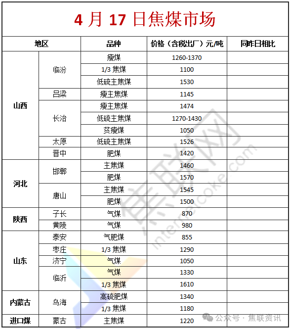 今日国内炼焦煤市场稳中上涨运行。供应方面,产地端个别事故及地质条件原因停产导致部分区域资源偏紧。市场价格经过前期调整后,现阶段产地整体出货稳定,煤矿报价多稳为主,个别矿点考虑自身情况煤价小幅调整。考虑近期五一假期前备库预期提振产地心态,部分矿点坑口报价小幅上探。价格方面,现山西吕梁地区主焦原煤(S1.3、G75、回收45)上调29元至出厂价882元/吨,主焦煤(A10.5、S0.9、G85)上调5元至出厂价1545元/吨;长治地区瘦原煤(S3、G60、回收50)上调14元至出厂价804元/吨,瘦精煤(A9.5、S2.8、G50)上调23元至出厂价1204元/吨,贫瘦原煤(A30、S0.5、G11)上调35元至出厂价725元/吨。需求方面,焦炭第二轮提涨落地,焦企利润有修复预期,补库积极性有所提升,对炼焦煤的采购需求稳步释放。钢厂方面,铁水产量持续维持高位,对焦炭的刚性需求支撑焦企开工率,进而带动炼焦煤需求。同时,市场对五一假期前的备货预期增强,采购量较前期稍有增加。综合来看,在供应端局部偏紧及需求端回暖的双重作用下,预计短期国内炼焦煤市场将延续稳中向好态势,部分紧俏煤种价格或有进一步上行空间。蒙煤方面,近期市场询货有所增加,下游开始适当采购,带动部分贸易商对后市情绪提升。但高库存明显抑制了蒙煤现货价格的上涨弹性。现蒙5原煤主流报价1060元/吨左右,蒙5精煤主流报价1220元/吨左右。