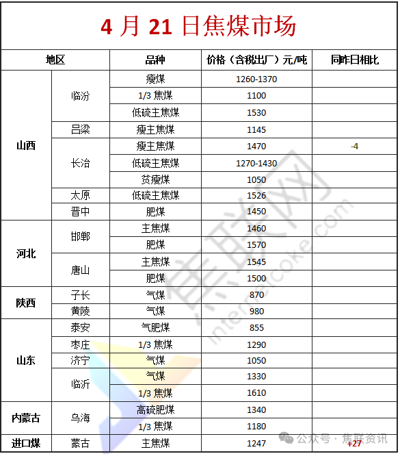 今日国内炼焦煤市场稳中上涨运行。供应方面,产地煤矿受安监扰动产能释放依旧有限,产量变化不大。受焦炭涨价落地影响,原料市场情绪有所提振,线上竞拍情绪活跃,成交价多有上涨,产地整体库存延续去化,多数矿点厂库处于中低位水平,整体看国内市场炼焦煤情绪好转,成交有所增加。价格方面,现山西吕梁地区主焦原煤(S1.3、G75、回收45)上调16元至出厂价898元/吨,主焦煤(A11、S0.6、G88)上调2元至出厂价1505元/吨,主焦煤(A10.5、S0.9、G85)下调13元至出厂价1532元/吨,主焦煤(A10.5、S3.0、G85)上调22元至出厂价1313元/吨,气原煤(S0.9、G55、回收48)上调16元至出厂价420元/吨;长治地区瘦主焦煤(A8.0、S0.5、G70)下调4元至出厂价1470元/吨,主焦煤(A9.5、S0.45、G65)上调10元至出厂价1370元/吨,瘦精煤(A10.5、S0.5、G50)下调50元至出厂价1200元/吨,主焦煤(A11.5、S1.0、G75)上调29元至出厂价1304元/吨;忻州地区气精煤(A9.5、S0.9、G65)上调5元至出厂价853元/吨,气原煤(S0.9、G60、回收55)下调1元至出厂价640元/吨,气原煤(S0.9、G50、回收45)下调25元至出厂价370元/吨。需求方面,焦炭第二轮提涨落地,焦企利润有所修复,部分焦企对部分降价幅度较大的优质煤种开始适量采购,补库积极性较前期提升。同时,五一假期临近,部分下游企业开始提前规划备货,对炼焦煤的采购需求形成一定支撑。综合来看,目前炼焦煤市场供需基本面尚可,在市场情绪好转及节前备货预期的推动下,预计短期国内炼焦煤市场将维持偏强震荡态势,部分煤种价格仍有上行空间。蒙煤方面,口岸市场情绪持续改善,贸易商挺价意愿增强,下游采购积极性提高,实际成交价格稳步回升,市场交投氛围进一步活跃。现蒙5原煤主流报价1080元/吨左右,蒙5精煤主流报价1247元/吨左右。