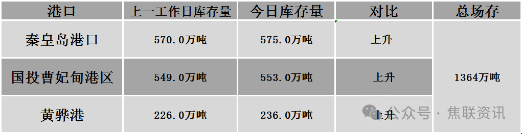 秦皇岛港铁路调入52.9万吨,装船47.9万吨,场存575万吨,锚地煤炭船23艘,预到9艘;国投曹妃甸港铁路调26.8万吨,装船23.0万吨,场存553.0万吨,锚地煤炭船舶14艘,预到3艘;黄骅港铁路调63.0万吨,装船68.0万吨,场存236万吨,锚地煤炭船舶91艘。