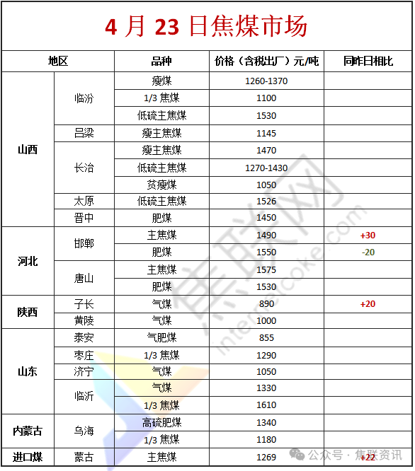 今日国内炼焦煤市场呈现稳中有涨格局。供应方面,产地煤矿多数供应基本正常,部分煤矿因事故等因素供应稍有收紧。铁水产量连续多周回升,部分焦化厂、洗煤厂已经陆续开始进场拿货补库,部分超跌煤种价格上涨,高位煤种补跌幅度也减小,短期内市场情绪的转变带动炼焦煤回暖,线上竞拍情绪高涨,线下煤矿坑口报价也在向上调整,进一步提振市场信心。价格方面,现山西临汾地区肥原煤(S4、G95、回收35)上调6元至出厂价774元/吨,肥原煤(S4、G95、回收40)下调2元至出厂价994元/吨;吕梁地区主焦煤(A11、S1.0、G80)下调20元至出厂价1480元/吨,瘦精煤(A10.5、S1.5、G70)上调20元至出厂价1290元/吨,瘦精煤(A8.5、S1.5、G45)上调20元至出厂价1310元/吨,主焦原煤(S1.3、G75、回收45)下调25元至出厂价873元/吨;长治地区瘦精煤(A10、S0.4、G32)上调2元至出厂价1144元/吨;忻州地区气原煤(S2.5、G60、回收45)下调63元至出厂价277元/吨。需求方面,焦炭提涨落地后焦企利润有所修复,补库需求逐步释放,加上五一假期临近,下游企业备货需求增加,进一步带动采购积极性提升,整体需求端支撑较强。不过当前部分下游企业对高价煤的接受度仍有限,采购仍以刚需及性价比较高的煤种为主。综合来看,当前供需两端均对市场形成支撑,情绪面也持续向好,预计短期国内炼焦煤市场将维持偏强运行态势。蒙煤方面,国内市场行情持续向好带动口岸情绪升温,贸易商报价坚挺,下游采购询盘活跃度进一步提升,实际成交价格稳步上行,交投氛围保持活跃。现蒙5原煤主流报价1100元/吨左右,蒙5精煤主流报价1247元/吨左右。