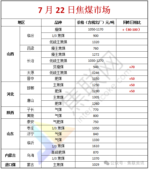 今日国内炼焦煤市场继续上行。供应方面,近期国家能源局将对部分超能力生产煤矿进行核查,焦煤供应缩减预期较强。随着多地企业对焦炭价格进行二轮提涨,下游情绪继续高涨,部分贸易商投机需求旺盛,叠加焦钢企业采购原料煤数量增加,矿方多新增订单,整体出货情况尚可,场地库存消耗无几,其中山西临汾乡宁地区部分煤矿主焦煤及瘦煤价格再度上调,炼焦煤需求阶段性向好。价格方面,现山西临汾地区瘦煤(A10-10.7、S0.4-0.8、G50-73)上调80-100元至出厂价1050-1170元/吨,主焦原煤(S0.8、G90、回收35)上调100元至出厂价760元/吨;吕梁地区主焦煤(A11、S0.7、G90)上调50元至出厂价1410元/吨,主焦煤(A11、S1.5、G80)上调70元至出厂价1120元/吨,高硫主焦煤(A10.5、S3.0、G85)上调131元至出厂价1044元/吨,气原煤(S0.9、G55、回收48)上调42元至出厂价402元/吨;长治地区贫煤(A10.5、S0.4、G10)上调20元至出厂价850元/吨,主焦煤(A11.5、S1.0、G85)上调170元至出厂价1200元/吨,主焦煤(A9.5、S0.45、G65)上调50元至出厂价1250元/吨,瘦精煤(A10.5、S0.5、G50)上调100元至出厂价1100元/吨,贫瘦精煤(A10.5、S0.4、G14)上调70元至出厂价940元/吨;晋中地区主焦煤(A15、S0.6、G75)上调35元至出厂价1000元/吨,肥煤(A9、S1.9、G95)上调50元至出厂价1150元/吨;太原地区瘦精煤(A12、S1.0、G60)上调50元至出厂价1030元/吨,瘦原煤(S1.5、G65、回收70)下调100元至出厂价560元/吨。需求方面,成材价格上涨,且期货盘面持红上行,带动焦钢市场情绪向好,部分焦钢企业对原料煤适量采购,加之部分地区钢厂接涨焦炭第二轮,短期煤价支撑较强。综合来看,短期内炼焦煤市场仍偏强运行。蒙煤方面,受国内下游市场情绪回暖,且期货盘面上行影响,提振蒙煤市场情绪较好,成交稍有回暖。现蒙5原煤主流报价860元/吨左右,蒙5精煤主流报价1029元/吨左右。