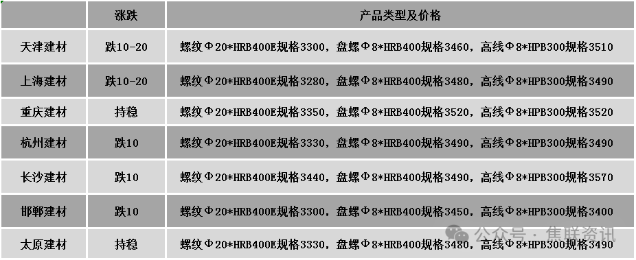 今日建筑钢材价格多数市场稳中偏弱运行,多数市场下跌10-20元/吨。24个螺纹钢主要市场中,13个市场下跌,占比54.17%,10个市场持平,占比41.66%,1个上涨,占比4.17%。期货方面:日盘螺纹2510开3277收3294,最高3330最低3249,涨11涨幅0.34%;铁矿2509开815.5收811.0,最高822.5最低803.5,跌4.5跌幅0.55%。行业方面:2025年7月中旬,重点统计钢铁企业共生产粗钢2141万吨,平均日产214.1万吨,日产环比增长2.1%;生铁1944万吨,平均日产194.4万吨,日产环比增长0.6%;钢材2080万吨,平均日产208.0万吨,日产环比增长4.6%。库存方面:本周五大主要钢材品种总库存下降1.16万吨至1336.5万吨,其中社会库存增加4.97万吨至927.08万吨,钢厂库存下降6.13万吨至409.42万吨。宏观方面:美国总统特朗普当地时间23日表示,将对世界其他大部分国家征收15%至50%的简单关税。中国进出口银行:上半年累计投放制造业贷款超4200亿元。广东上半年地产开发贷款和购房贷款双双正增长。市场监管总局着力整治质量领域“内卷式”竞争。2025年1-6月全国电力市场交易电量同比增长4.8% 跨省跨区交易电量同比增长18.2%。中国黄金协会:2025年上半年我国黄金产量179.083吨 同比下降0.31%。市场方面:焦煤主力再次拉升至涨停位,黑色系受市场情绪提振,但尾盘钢铁、焦炭品种大幅回撤,螺纹、热卷收报小阳线;焦煤主力连续4日大幅拉涨,涨停至1198.5元/吨,焦炭主力收盘回落至1735.0元/吨,涨幅近2%。近期宏观利好消息多,现货价格连续拉涨,部分商家开始获利套现,且日盘期螺上涨乏力,现货价格有所松动,但考虑到原料价格上涨对钢价起到明显的推动作用,预计短期建材现货价格或稳中窄幅波动运行。