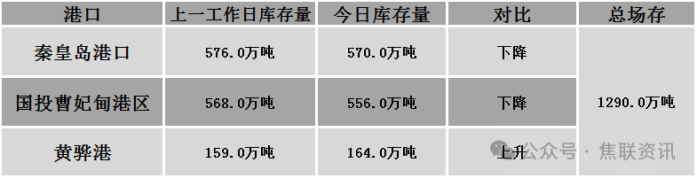 秦皇岛港铁路调入38.9万吨,装船44.9万吨,场存570万吨,锚地煤炭船17艘,预到5艘;国投曹妃甸港铁路调10.1万吨,装船22.0万吨,场存556万吨,锚地煤炭船舶10艘,预到5艘;黄骅港铁路调64.0万吨,装船62.0万吨,场存164万吨,锚地煤炭船舶51艘,预到0艘。