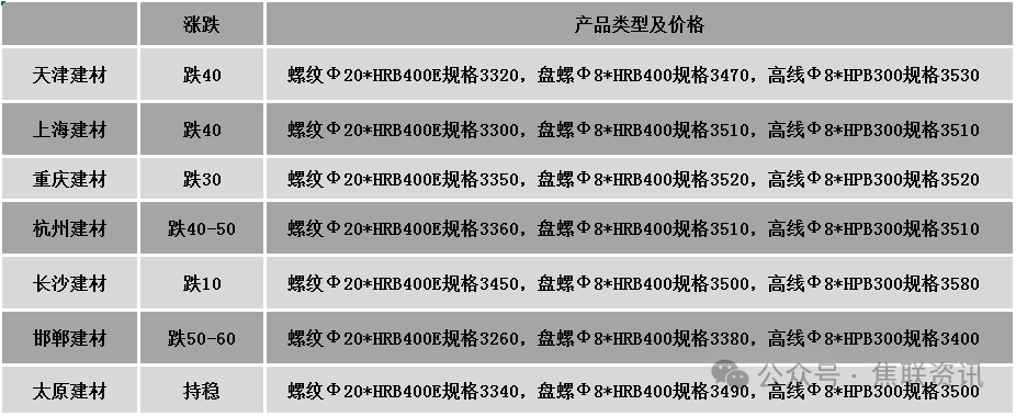 今日建筑钢材价格市场弱势下跌运行,多数市场下跌10-60元/吨。24个螺纹钢主要市场中,22个市场下跌,占比91.67%,2个市场持平,占比8.33%。期货方面:日盘螺纹2510开3352收3248,最高3352最低3230,跌68跌幅2.05%;铁矿2509开802.5收786.0,最高806.5最低780.5,跌14.0跌幅1.75%。钢厂调价:江苏鸿泰螺纹钢下调10;玉溪仙福、玉溪玉昆建材上调20;达钢重庆建材上调230;山西晋南建材下调20-290。行业方面:2025年6月,我国出口钢材967.8万吨,较上月下降8.5%,自今年3月以来环比首次出现下降,出口均价687.1美元/吨,较上月小幅下跌1.6%。1-6月,我国累计出口钢材5814.7万吨,同比增长8.9%,出口均价699.3美元/吨,同比下跌10.2%。6月,我国进口钢材47.0万吨,环比下降2.4%,进口均价1712.5美元/吨,环比下跌2.1%。1-6月,我国累计进口钢材302.3万吨,同比下降16.4%,进口均价1686.4美元/吨,同比上涨2.2%。宏观方面:据国家统计局,1—6月份,全国规模以上工业企业实现利润总额34365.0亿元,同比下降1.8%;6月份,规模以上工业企业利润同比下降4.3%。美国总统特朗普27日表示,美国已与欧盟达成15%税率的关税协议,欧盟将比此前增加对美国投资6000亿美元,欧盟将购买美国军事装备,并将购买价值7500亿美元的美国能源产品。欧盟委员会主席冯德莱恩表示,包括汽车在内的各类商品将适用15%的关税税率。市场方面:市场情绪快速回落,焦煤主力上周五大幅下挫,最低跌至1110.5元/吨,日盘,焦煤期货全部合约快速跌停,主力2509合约跌幅达11%,收报于1100.5元/吨;焦炭主力也紧随跟跌,收报跌停至1608.5元/吨;受原料端双焦跌停拖累,螺纹、热卷主力跌幅均超2%,回吐上周二以来的大部分涨幅。期钢价格弱势下行,现货价格跟随下跌,市场观望氛围浓厚,低价资源不断显现,高位成交明显疲弱。由于上周价格上涨过快,下游终端和商家都有恐高情绪,且需求表现乏力,预计短期建材现货价格或跟随期钢价格的走低而下移。