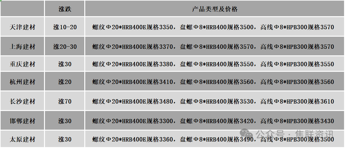 今日建筑钢材价格市场继续上涨运行,绝大多数市场上涨10-60元/吨。24个螺纹钢主要市场中,22个市场上涨,占比91.67%,2个市场持平,占比8.33%。期货方面:日盘螺纹2510开3350收3315,最高3384最低3291,涨14涨幅0.42%;铁矿2509开798.0收789.0,最高807.5最低786.5,跌3.5跌幅0.44%。钢厂调价:达钢重庆建材上调10;山西晋南建材上调30-40;云南德胜、玉溪仙福、玉溪玉昆建材上调40;首钢长治建材上调40-60;江苏鸿泰螺纹钢上调80;南钢螺纹钢上调230。行业方面:上半年中钢协重点统计钢铁企业累计营业收入为29985亿元,同比下降5.79%;营业成本为28055亿元,同比下降6.83%;利润总额为592亿元,同比增长63.26%;平均利润率为1.97%,同比上升0.83个百分点。宏观方面:中共中央政治局:宏观政策要持续发力、适时加力;增强国内资本市场的吸引力和包容性 巩固资本市场回稳向好势头;要扩大高水平对外开放 稳住外贸外资基本盘;依法依规治理企业无序竞争 推进重点行业产能治理。中共中央政治局召开会议 决定召开二十届四中全会 分析研究当前经济形势和经济工作。财政部:6月全国发行新增债券6281亿元。市场方面:昨日期钢强势上涨,螺纹主力升至近半年高位3384点,早盘期钢回吐涨幅,午后价格继续回落,收盘螺纹、热卷小幅收红;焦煤、焦炭主力大幅上涨,焦煤2601合约一度涨停,焦炭主力收盘涨幅4%,焦煤主力收盘涨幅2.71%。期螺震荡回落,现货价格延续昨日小幅上涨态势,下游询货采购减少,市场悲观情绪渐起,商家有小幅下调价格出货,积极降库出货为主,整体成交表现一般,预计短期建材现货价格或窄幅震荡运行。