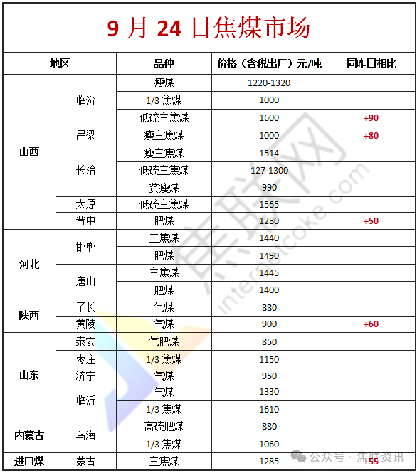 今日国内炼焦煤市场价格窄幅震荡运行。供应方面,产地多数煤矿开工维持正常。近期贸易商普遍拿货积极,炼焦煤需求较好,成交活跃,煤矿出货顺畅,当前库存大多处于低位水平,昨日焦煤线上竞拍全数成交,线上竞拍整体趋势仍以上涨为主,但考虑焦煤价格近期反弹致使焦企利润进一步走差,煤价涨幅有限。价格方面,现山西临汾地区低硫主焦煤(A9、S0.5、V20、G85)上调80元至出厂价1580元/吨,主焦煤(A9.5、S0.5、G80)上调238元至出厂价1588元/吨,主焦煤(A11、S3.5、G92)上调8元至出厂价973元/吨,肥原煤(S4、G95、回收35-40)上调68-73元至出厂价553-665元/吨,肥煤(A10.5、S3.8、G90)上调15元至出厂价905元/吨,瘦精煤(A10.5、S0.6、G40)上调162元至出厂价1441元/吨,气肥煤(A10.5、S0.7、G95)上调98元至出厂价1212元/吨;吕梁地区主焦煤(A11、S1、G85)上调73元至出厂价1439元/吨,主焦煤(A8.5、S2.2、G75)上调13元至出厂价1173元/吨,主焦煤(A9.5、S1.3、G78)上调19元至出厂价1169元/吨,瘦主焦煤(A8.5、S2.2、G75)上调80元至出厂价1000元/吨,瘦精煤(A9、S1.3、G70)上调20元至出厂价1310元/吨;长治地区贫瘦精煤(A10.5、S0.35、G15)上调100元至出厂价1131元/吨;晋中地区主焦煤(A15、S0.6、G75)上调50元至出厂价1130元/吨,肥煤(A13.5、S0.7、G90)上调50元至出厂价1080元/吨,肥煤(A9、S1.9、G95)上调50元至出厂价1280元/吨;太原地区1/3焦煤(A10、S1.8、G85)上调62元至出厂价1120元/吨;陕西黄陵地区气精煤(A7.0、S0.45、G70)上调60元至出厂价900元/吨。需求方面,临近双节且铁水产量增长,焦钢企业按需采买,双焦刚需性较强。但主流焦企尚未对焦炭提涨表态,加之近期连续补库下厂内原料库存已有回升,市场多以观望为主。综合来看,预计短期国内炼焦煤市场偏稳为主,个别煤种价格小幅震荡。蒙煤方面,随着市场情绪逐渐升温,口岸下游询盘问货较为积极,蒙煤成交继续走强。现蒙5原煤主流报价1038元/吨左右,蒙5精煤主流报价1285元/吨左右。