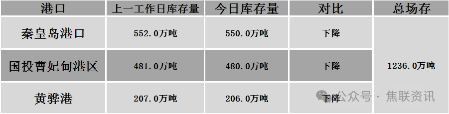 秦皇岛港铁路调入44.6万吨,装船46.6万吨,场存550万吨,锚地煤炭船16艘,预到10艘;国投曹妃甸港铁路调14.3万吨,装船15.5万吨,场存480万吨,锚地煤炭船舶5艘,预到5艘;黄骅港铁路调58.0万吨,装船63.0万吨,场存206万吨,锚地煤炭船舶74艘,预到0艘。