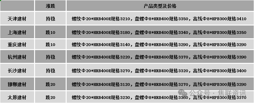 今日建筑钢材价格稳中小幅下行,部分市场下调10-20元/吨。24个螺纹钢主要市场中,15个市场持平,占比62.5%,9个市场下跌,占比37.5%。期货方面:日盘螺纹2601开3156收3164,最高3179最低3140,涨1涨幅0.03%;铁矿2601开804.0收803.5,最高808.0最低800.0,涨0.0涨幅0.00%。行业方面:海关总署数据显示,2025年1-8月国内钢坯出口总量共计923.62万吨,年同比增加293.24%;国内钢坯进口总量共计58.42万吨,年同比减少62.30%。宏观方面:国家能源局:1—8月全国电力市场交易电量同比增长7.0%。六部门印发《建材行业稳增长工作方案(2025—2026年)》。三部门:到2027年集装箱铁水联运量年均增长15%左右。商务部:中国在世贸谈判中将不寻求新的特殊和差别待遇。高盛预计未来几个月美元将进一步走弱。美联储主席鲍威尔重申未来没有无风险的政策路径,他还表示,部分资产价格相对历史水平处于高位,从许多指标来看,股票价格估值相当高。市场方面:受国内股市反弹提振,钢材期货震荡小涨,螺纹、热卷期货收盘微幅上涨,螺纹主力收报于3164元/吨,热卷主力收报于3357元/吨;受旺季需求恢复缓慢,叠加“加大铁矿石、炼焦煤等原燃料保供稳价力度”再次提及,焦煤、焦炭期货区间震荡运行,双焦主力收盘涨幅均超1%。昨日夜盘期螺窄幅震荡走低,早盘现货价格小幅松动,午后期螺盘面偏弱震荡,部分商家报价小幅下调,因下游需求恢复缓慢,商家库存持续累积,部分商家降价出货,积极降库操作,终端用户按需采购,市场交易氛围表现一般。临近国庆长假,下游补库渐近尾声,现货价格上涨动力不足,预计短期建材现货价格或趋稳运行。
