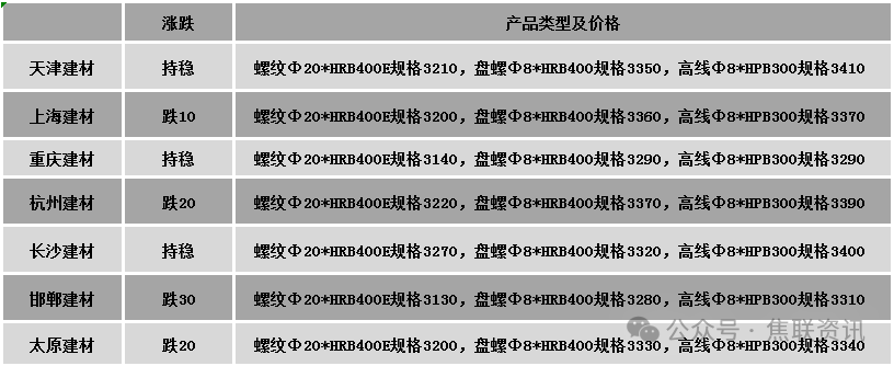 今日建筑钢材价格稳中偏弱运行,部分市场下跌10-30元/吨。24个螺纹钢主要市场中,17个市场持平,占比70.83%,7个市场下跌,占比29.17%。期货方面:日盘螺纹2601开3165收3114,最高3171最低3113,跌50跌幅1.58%;铁矿2601开804.0收790.0,最高806.0最低788.0跌14.0跌幅1.74%。行业方面:全国90家独立电弧炉钢厂平均产能利用率52.07%,环比下降2.28个百分点,同比上升8.42个百分点。全国90家独立电弧炉钢厂平均开工率67.36%,环比下降3.27个百分点,同比上升3.54个百分点。宏观方面:美国总统特朗普宣布,自10月1日起,对厨房橱柜、浴室洗手台及相关建材征收50%进口关税,对进口家具征收30%关税,并对专利及品牌药品加征100%关税。国家能源局数据显示,1-8月份全国太阳能发电装机容量11.2亿千瓦,同比增长48.5%。美联储洛根表示,美联储已到时机,需对利率目标体系进行现代化改造;现在是时候为新的基准利率做好准备了。市场方面:日盘黑色系期货震荡运行,螺纹、热卷价格震荡小幅下移,螺纹主力最低下探至3113元/吨,热卷主力最低下探至3312元/吨;焦炭、焦煤主力峰值继续下移,焦炭主力收盘跌幅超1%,焦煤主力最低下跌至1195.0点。期螺窄幅震荡下行,现货价格稳中偏弱,前期受雨水天气影响,终端施工进度受限,节前备货逐渐减少,铁水产量继续走高,节前去库存压力仍在,终端采购依旧谨慎,商家多维持低库存运行,市场逐渐进入节日氛围,整体成交表现一般,预计短期建材现货价格或稳中局部波动为主。