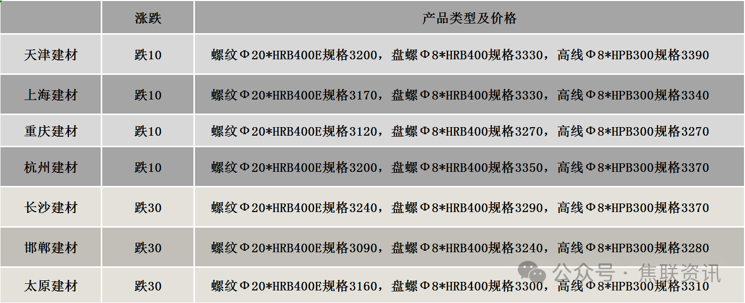 今日建筑钢材价格弱势下跌运行,大多数市场下跌10-30元/吨。24个螺纹钢主要市场中,20个市场下跌,占比83.33%,4个市场持平,占比16.67%。钢厂方面:江苏鸿泰螺纹钢下调10;新抚钢建材下调20-50。行业方面:中指研究院:8月房地产行业债券融资总额为553.1亿元,同比下降4.3%,发债房企主要为央国企。前8个月,房地产企业债券融资总额为3808.9亿元,同比微增0.8%。宏观方面:国家统计局最新数据显示,2025年1-8月,全国规模以上工业企业实现利润总额46929.7亿元,同比增长0.9%;其中,1-8月,黑色金属冶炼和压延加工业利润总额837亿元,同比由亏转盈。工信部等八部门印发《有色金属行业稳增长工作方案(2025—2026年)》。1-8月全国新开工改造城镇老旧小区2.17万个。中国贸促会:7月份美国、欧盟和巴西全球经贸摩擦指数位居前三。交通运输部:前8月完成营业性货运量同比增长3.8%。美联储10月降息25个基点的概率为87.7%。市场方面:今日建材现货价格弱势下行,节前下游企业补库备货意愿较低,市场商家报价小幅松动,且随着周五期钢盘面的走低,建材现货价格高位下移,且跌幅有所放大,市场情绪明显低落,高位出货困难,仅低价资源流动。随着国庆小长假的来临,市场上节日氛围逐渐浓厚,贸易商陆续离市放假,市场成交较为谨慎,预计短期建材现货价格或偏弱运行为主。
