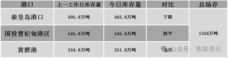 秦皇岛港铁路调入32.8万吨,装船65.8万吨,场存562万吨,锚地煤炭船21艘,预到7艘;国投曹妃甸港铁路调11.7万吨,装船11.5万吨,场存545万吨,锚地煤炭船舶3艘,预到4艘;黄骅港铁路调55.0万吨,装船71.0万吨,场存251万吨,锚地煤炭船舶74艘,预到0艘。