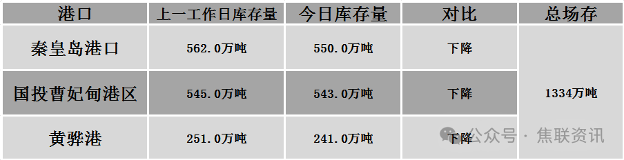 秦皇岛港铁路调入44.2万吨,装船56.2万吨,场存550万吨,锚地煤炭船20艘,预到4艘;国投曹妃甸港铁路调10.9万吨,装船13.0万吨,场存543万吨,锚地煤炭船舶0艘,预到5艘;黄骅港铁路调57.0万吨,装船57.0万吨,场存241万吨,锚地煤炭船舶73艘,预到0艘。