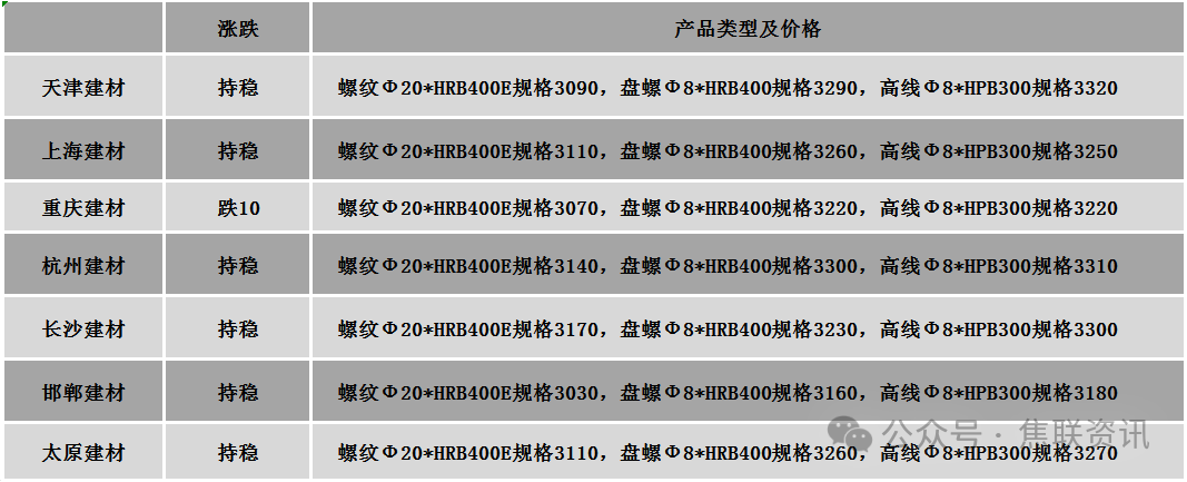 今日建筑钢材价格稳中偏弱运行,部分市场下跌10-20元/吨。24个螺纹钢主要市场中,18个市场持平,占比75%,6个市场下跌,占比25%。期货方面:日盘螺纹2601开3045收3047,最高3065最低3036,跌11跌幅0.36%;铁矿2601开768.5收769.5,最高776.5最低760.0涨 1.0涨幅0.58%。钢厂调价:沙钢10月下旬建材出厂价格与上期持平。中天钢铁建材下调50。达钢重庆建材下调10。行业方面:上周(10月13日-10月19日),10个重点城市新建商品房成交(签约)面积总计163.86万平方米,环比增长63.7%,同比下降17%。同期,10个重点城市二手房成交(签约)面积总计218.37万平方米,环比增长70.5%,同比下降13.6%。宏观方面:高盛:全球石油市场供应过剩“开始显现”。河南省前三季度进出口额同比增长18.7% 外贸规模再创历史同期新高。多家银行下调存款利率:有产品直降80个基点 有的“存三年不如存一年”。荷兰方面近日释放信号,将寻求与中方会面,商讨解决安世半导体当前陷入的“僵局”。日盘钢材期货延续低位震荡运行,螺纹、热卷收盘微幅收绿;焦煤、焦炭主力大幅下跌,收盘均跌超3%。期螺震荡走弱,现货市场情绪偏弱,终端用户采购意愿偏弱,商家多数报价持稳,谨慎观望为主,投机性需求较差,预计短期建材现货价格或弱稳运行。