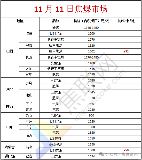 今日国内炼焦煤市场价格稳中偏强运行。供应方面,矿上产能释放有限,短期难有明显增量,供应维持偏紧状态。近期下游补库积极,焦煤线上竞拍氛围相对较好,多数煤种仍保持涨势,成交率较高,线下交投氛围也较为热烈,煤矿签单顺利,预售订单较多。但近期煤价临近高位,中间贸易商环节出现恐高情绪,采购偏谨慎,部分资源出现降价及流拍,影响市场交投氛围稍有回落。价格方面,现山西临汾地区肥原煤(S4、G95、回收35-40)上调51-54元至出厂价649-945元/吨;吕梁地区主焦煤(A11、S0.6、G88)上调10元至出厂价1650元/吨,主焦煤(A10.5、S3.0、G85)上调16元至出厂价1382元/吨;长治地区主焦煤(A8、S0.4、G65)上调30元至出厂价1600元/吨,主焦煤(A9.5、S0.45、G65)上调20元至出厂价1500元/吨,瘦主焦煤(A8.0、S0.5、G70)上调32元至出厂价1602元/吨,瘦原煤(S3、G60、回收50)下调39元至出厂价765元/吨;晋中地区主焦煤(A7、S3.1、G85)上调105元至出厂价1405元/吨,肥煤(A14、S1.3、G95)上调42元至出厂价1463元/吨。需求方面,下游焦企产能利用率较稳,加之厂内部分原料煤库存处于低位水平,焦企刚需采购积极性不减。但考虑焦企提出冶金焦第四轮涨价,钢厂仍未回应,利润压力下也有部分焦企因近期煤价涨价速度较快而放缓了补库节奏,以按需采购为主。综合来看,预计短期国内炼焦煤市场稳中向好运行,部分煤种仍有探涨预期。蒙煤方面,下游采购情绪一般,市场观望情绪增加,贸易商当前以挺价为主。现蒙5原煤主流报价1111元/吨左右,蒙5精煤主流报价1434元/吨左右。