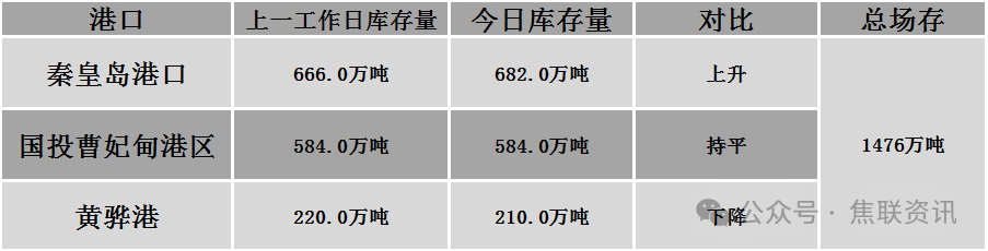 秦皇岛港铁路调入58.1万吨,装船42.1万吨,场存682万吨,锚地煤炭船13艘,预到5艘;国投曹妃甸港铁路调18.5万吨,装船18.5万吨,场存584万吨,锚地煤炭船舶1艘,预到3艘;黄骅港铁路调53.0万吨,装船54.0万吨,场存210万吨,锚地煤炭船舶36艘,预到0艘。