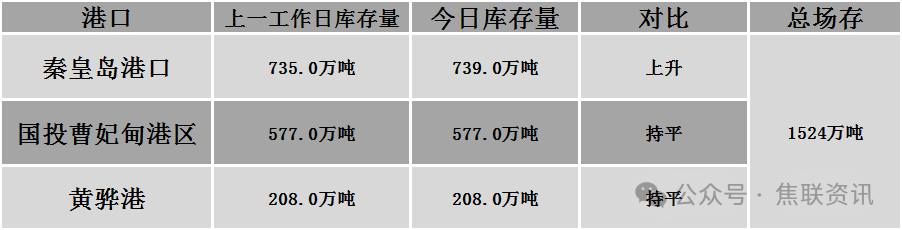 秦皇岛港铁路调入55.3万吨,装船51.3万吨,场存739万吨,锚地煤炭船22艘,预到9艘;国投曹妃甸港铁路调16.8万吨,装船16.5万吨,场存577万吨,锚地煤炭船舶2艘,预到1艘;黄骅港铁路调57.0万吨,装船62.0万吨,场存208万吨,锚地煤炭船舶45艘,预到0艘。