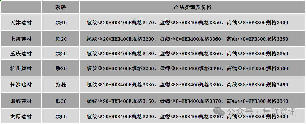 今日建筑钢材价格弱势下跌运行,绝大多数市场下跌10-40元/吨左右。24个螺纹钢主要市场中,20个市场下跌,占比83.33%,4个市场持平,占比16.67%。期货方面:日盘螺纹2605开3157收3123,最高3157最低3110,跌41跌幅1.30%;铁矿2605开767.5收760.5,最高768.0最低760.0,跌11.0跌幅1.43%。钢厂调价:玉溪仙福、玉溪玉昆、云南德胜建材下调10;达钢重庆建材下调20。行业方面:海关总署数据显示,2025年11月中国出口钢材998.0万吨,较上月增加19.8万吨,环比增长2.0%;1-11月累计出口钢材10771.7万吨,同比增长6.7%。11月中国进口钢材49.6万吨,较上月减少0.7万吨,环比下降1.4%;1-11月累计进口钢材554.1万吨,同比下降10.5%。宏观方面:中共中央政治局召开会议,分析研究2026年经济工作:明年经济工作要坚持稳中求进、提质增效 继续实施更加积极的财政政策和适度宽松的货币政策;着力稳就业、稳企业、稳市场、稳预期 推动经济实现质的有效提升和量的合理增长。海关总署公布,今年前11个月,我国货物贸易保持增长,进出口总值41.21万亿元,同比增长3.6 %。国家税务总局在例行新闻发布会上公布数据,今年前11个月,办理离境退税的境外旅客数量同比增长285%,退税商品销售额和退税额同比增长98.8%。市场方面:日盘期钢价格延续弱势下跌格局,双焦价格大幅下跌对盘面形成明显拖累,螺纹、热卷收盘跌幅超1%,螺纹收报于3123元/吨,热卷跌破3300元/吨;焦煤2601合约最低下探至997元/吨,跌幅超7%,焦炭主力收盘跌幅近6%。随着期钢的延续下行,现货价格下跌范围扩大,终端采购仍以刚需为主,商家出货情绪较强,低价出货套现情况增多,市场交易表现一般,整体成交价格重心下移,预计短期建材现货价格或弱势小幅下跌运行为主。
