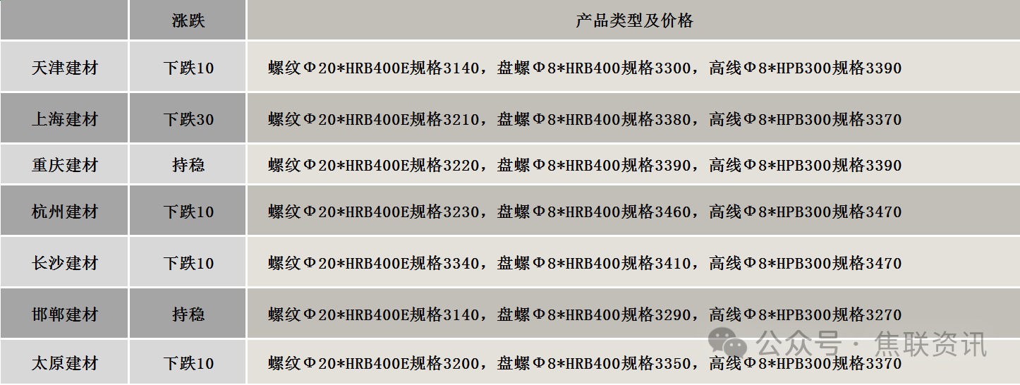 今日建筑钢材价格稳中偏弱运行,局部市场下跌10-40元/吨。24个螺纹钢主要市场中,14个市场持平,占比58.33%,10个市场下跌,占比41.67%。期货方面:日盘螺纹2605开3132收3118,最高3132最低3090,跌13跌幅0.42%;铁矿2605开778.0收783.0,最高784.5最低772.0,涨5.5涨幅0.71%。钢厂调价:江苏鸿泰螺纹钢下调10;陕钢西安建材下调20。行业方面:国家发改委发表《大力推动传统产业优化提升》。当前,钢铁、石化等原材料行业普遍面临供需动态性平衡不足、产品结构不优等问题。“十五五”时期,原材料行业要深化供给侧结构性改革,坚持供需两侧协同发力,增加高端产能供给,确保总量规模适度、供需基本平衡、产品结构升级。加强行业管理,坚持“减油、增化、提质”,持续实施粗钢产量调控,严禁违规新增产能,促进优胜劣汰。宏观方面:国家统计局公布,经最终核实,2024年,GDP现价总量为1348066亿元,比初步核算数减少1018亿元;按不变价格计算,比上年增长5.0%,与初步核算数持平。央行等三部门:鼓励符合条件的金融机构发行“三农”专项金融债券。工信部:2026年要深入整治“内卷式”竞争 坚决遏制低价低质量竞争。工信部:新培育一批“小巨人”企业、制造业单项冠军企业和国家级中小企业特色产业集群。工信部:预计2025年规模以上工业增加值同比增长5.9%。市场方面:日盘螺纹、热卷期货先跌后涨,收盘微幅收绿;焦煤大幅下跌至1073点后反弹,收盘跌幅超1%,焦炭与焦煤波动幅度大体相同,最低下探至1677.5元/吨。受期螺偏弱运行影响,现货价格部分松动,下游维持按需采购,贸易商降库出货为主,市场议价交易情况增加,成交表现较为平淡,整体交易心态偏谨慎,预计短期建材现货价格或窄幅低位运行。
